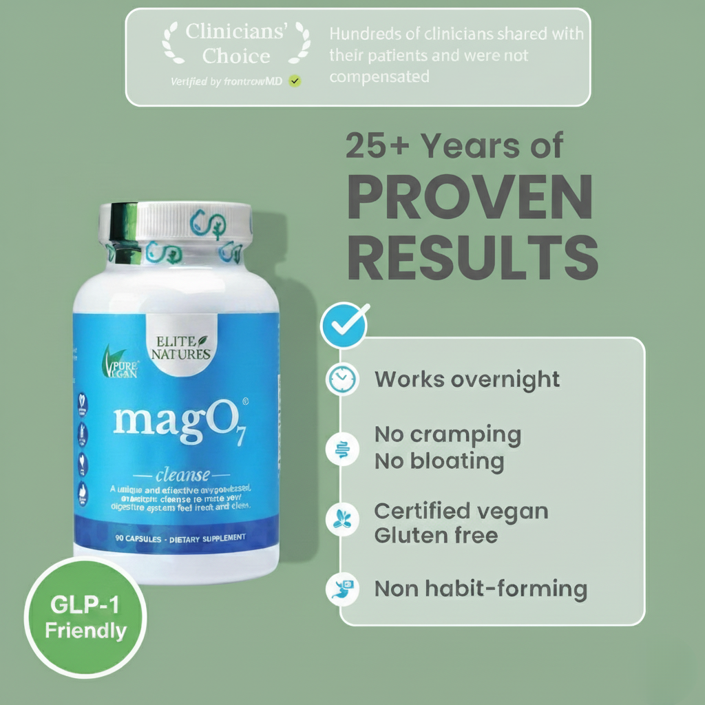 Elite Natures MagO7 is a gentle, overnight colon cleanser and detox designed to reset your gut and support better digestion. Made with oxygenated magnesium oxide, it helps relieve occasional constipation, soften stools, and reduce bloating — all without cramps or habit-forming effects. Perfect for travel, low-fiber diets like keto, or anyone on a GLP-1 weight loss journey, MagO7 provides a safe, natural way to keep your gut clean and healthy.