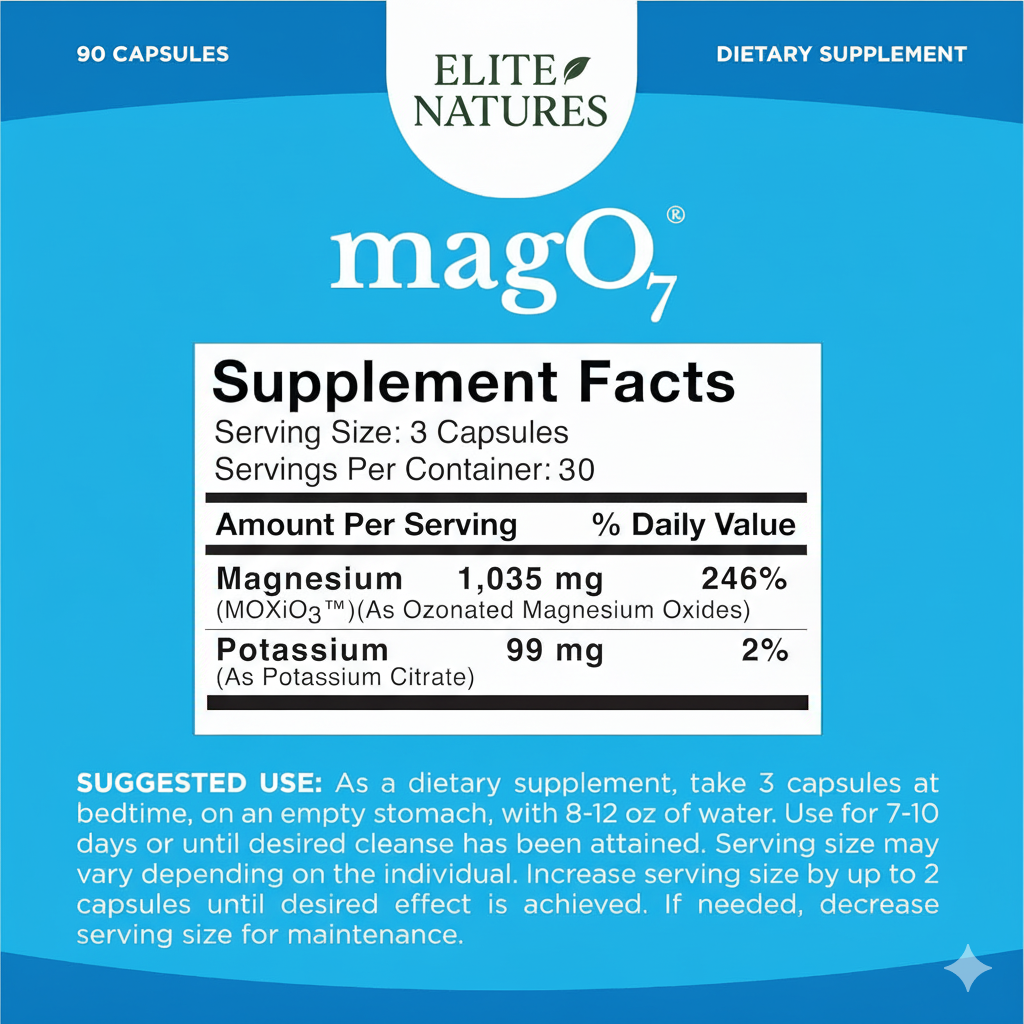 Elite Natures MagO7 is a gentle, overnight colon cleanse and digestive reset designed to support gut health naturally. Formulated with oxygenated magnesium oxide, it helps relieve occasional constipation, soften stools, and reduce bloating—without harsh side effects or habit-forming ingredients.
